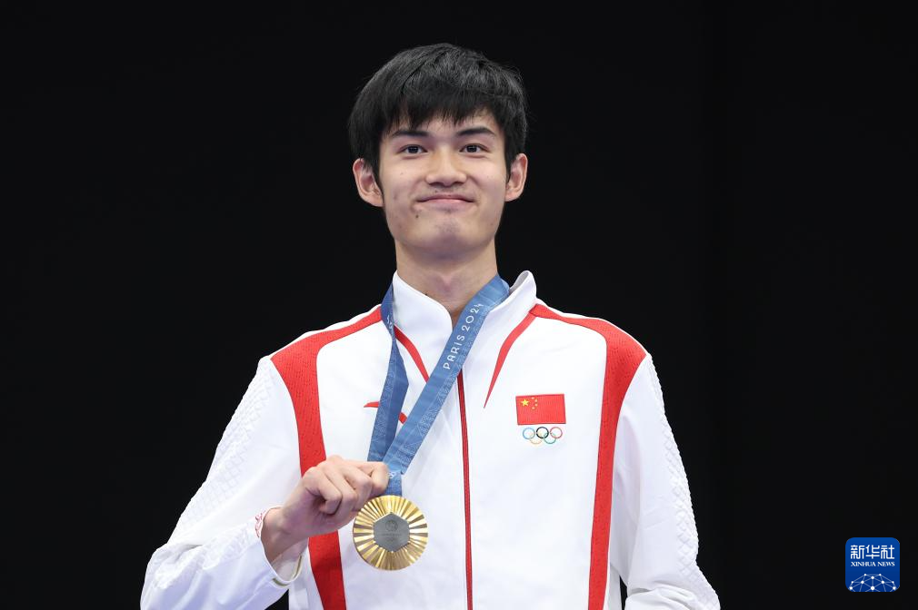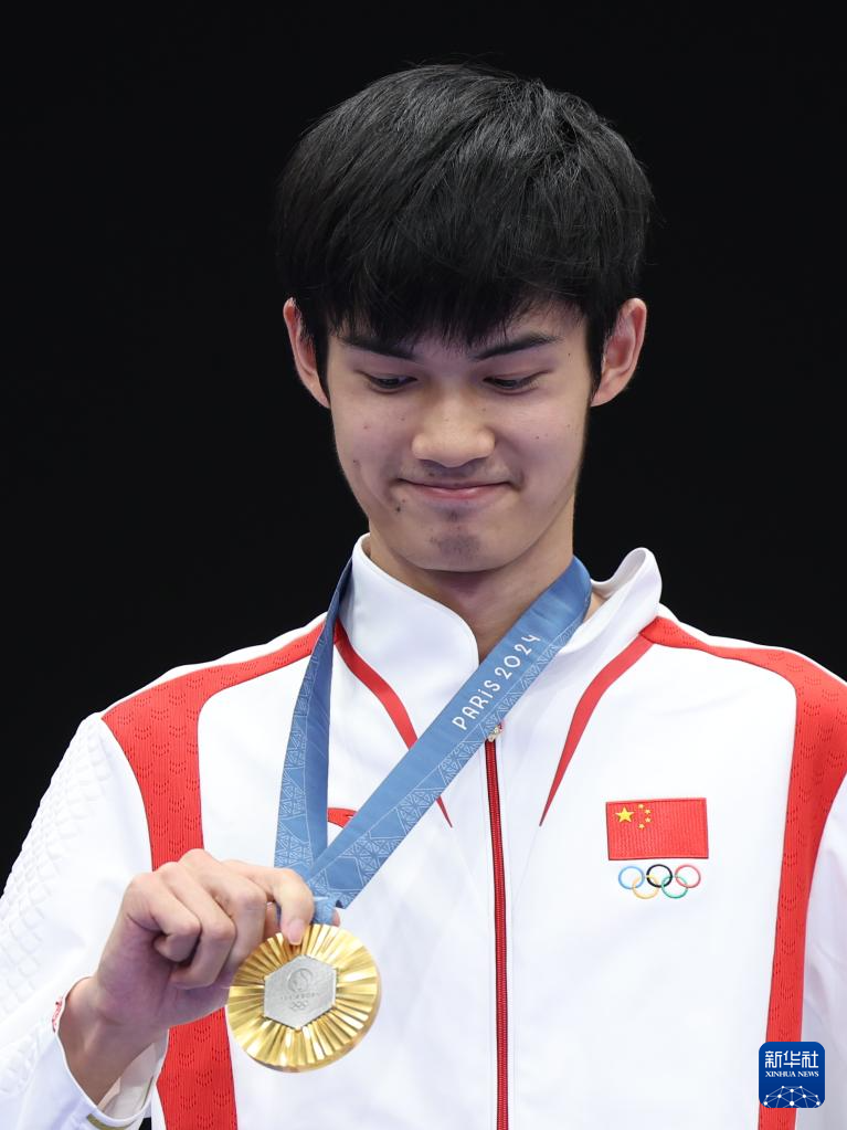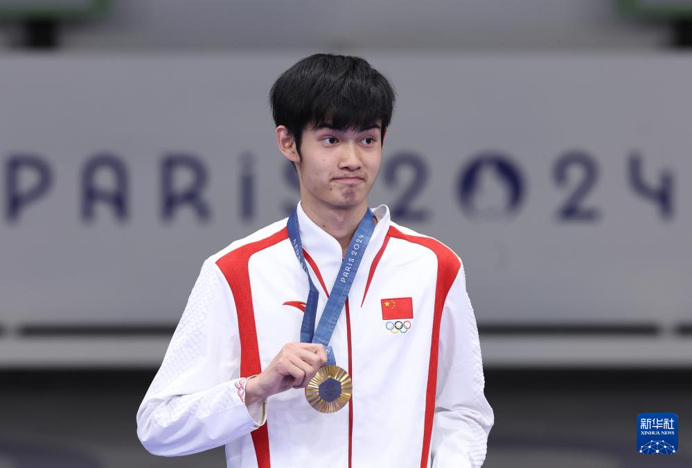7月29日,中国选手盛李豪展示金牌。新华社记者 张帆 摄