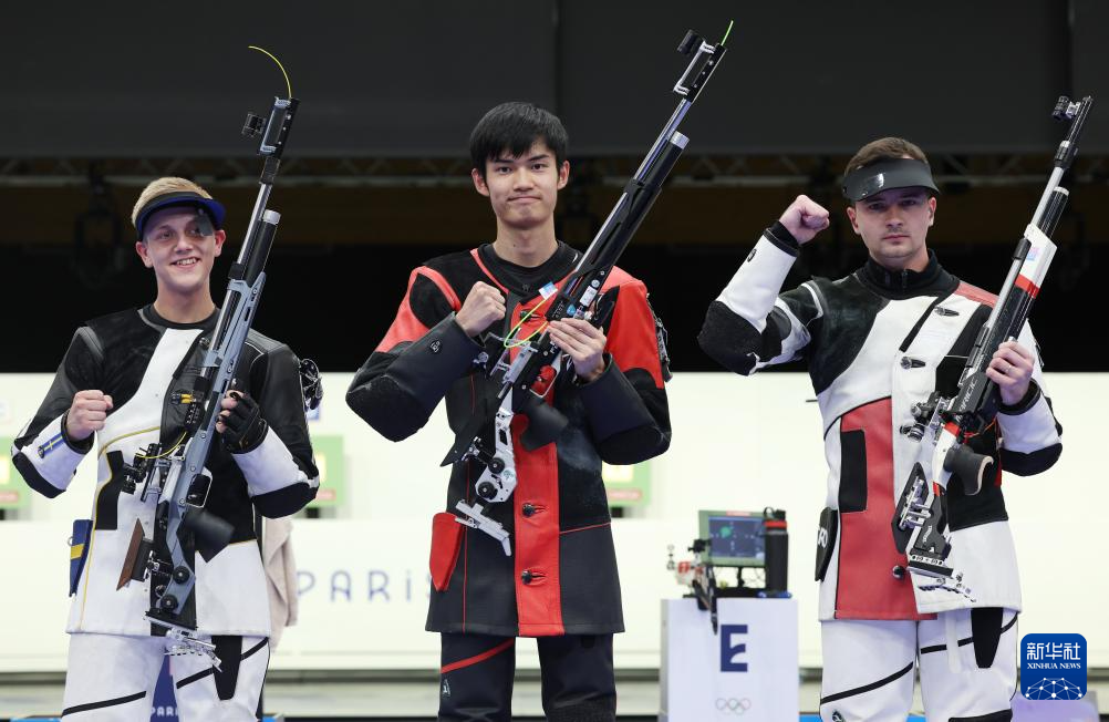 7月29日,盛李豪(中)在比赛中。当日,在法国沙托鲁举行的巴黎奥运会射击男子10米气步枪决赛中,中国选手盛李豪获得冠军。新华社记者 赵丁喆 摄