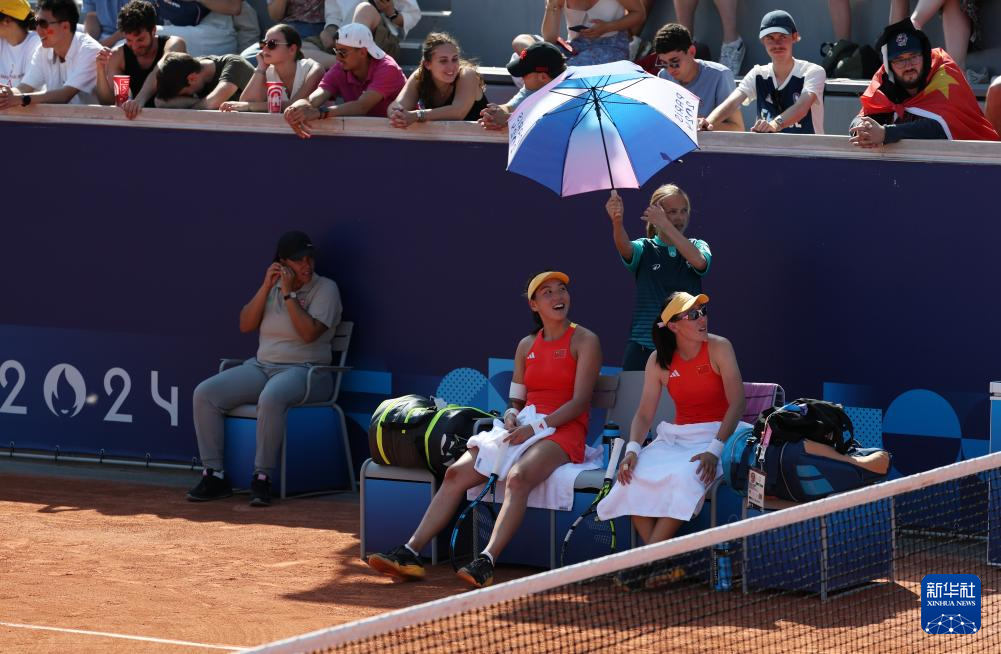 7月29日,中国组合王欣瑜(下左)/郑赛赛(下右)在比赛间隙。