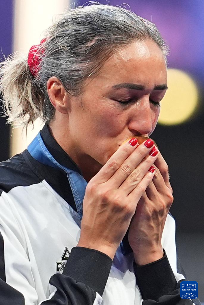 7月30日,新西兰队球员希里尼在颁奖仪式上亲吻金牌。