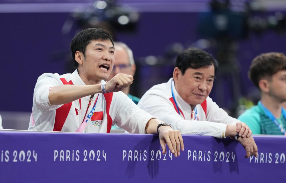 8月1日,中国队教练雷声(左)在现场指导。新华社记者 费茂华 摄