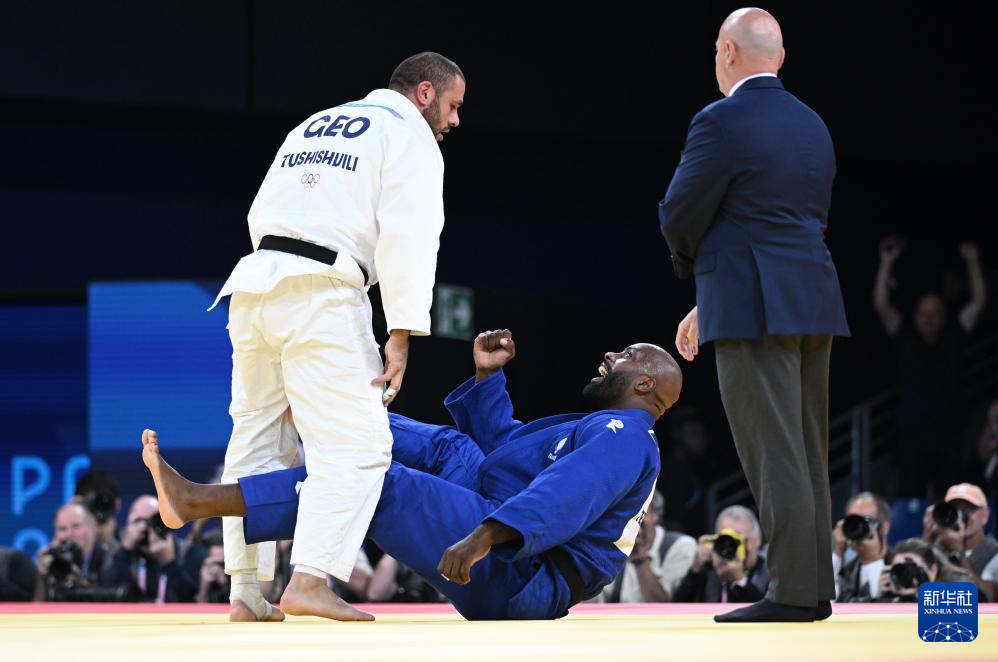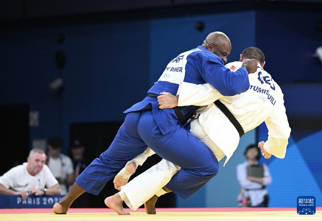 8月2日,在柔道男子100公斤以上级四分之一决赛中,法国选手里内(蓝)战胜格鲁吉亚选手图希什维利。新华社记者 武巍 摄