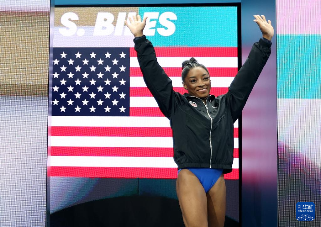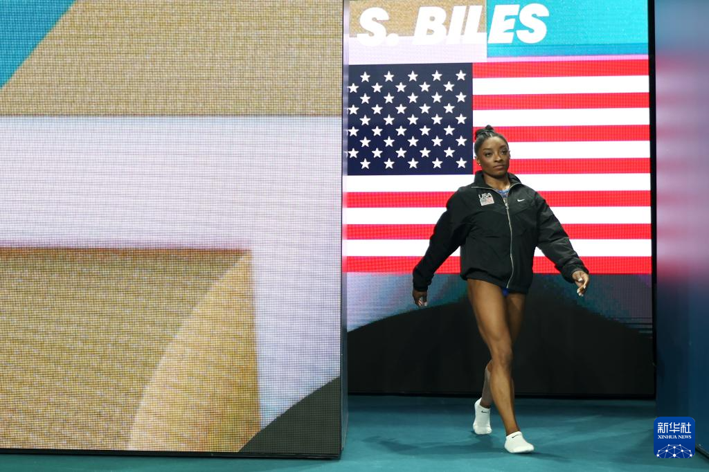 8月1日,美国选手拜尔斯在比赛前出场。新华社记者 曹灿 摄