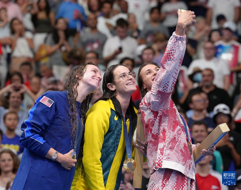 8月2日,冠军澳大利亚选手麦基翁(中)、亚军美国选手史密斯(左)和季军加拿大选手马斯在颁奖仪式上自拍。