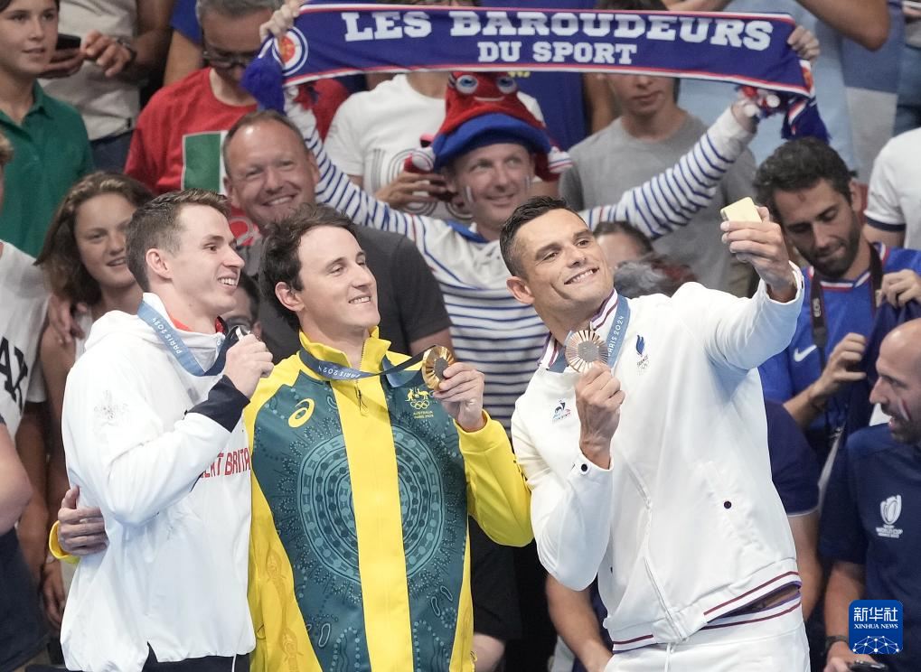 8月2日,冠军澳大利亚选手麦克沃伊(中)、亚军英国选手普劳德(左)、季军法国选手马诺杜在颁奖仪式上合影。