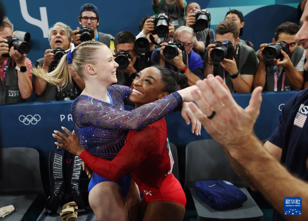 8月3日,拜尔斯(右)和凯莉在比赛后拥抱庆祝。