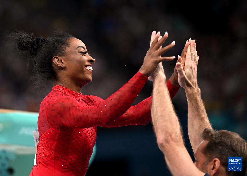 8月3日,拜尔斯(左)在比赛后庆祝。