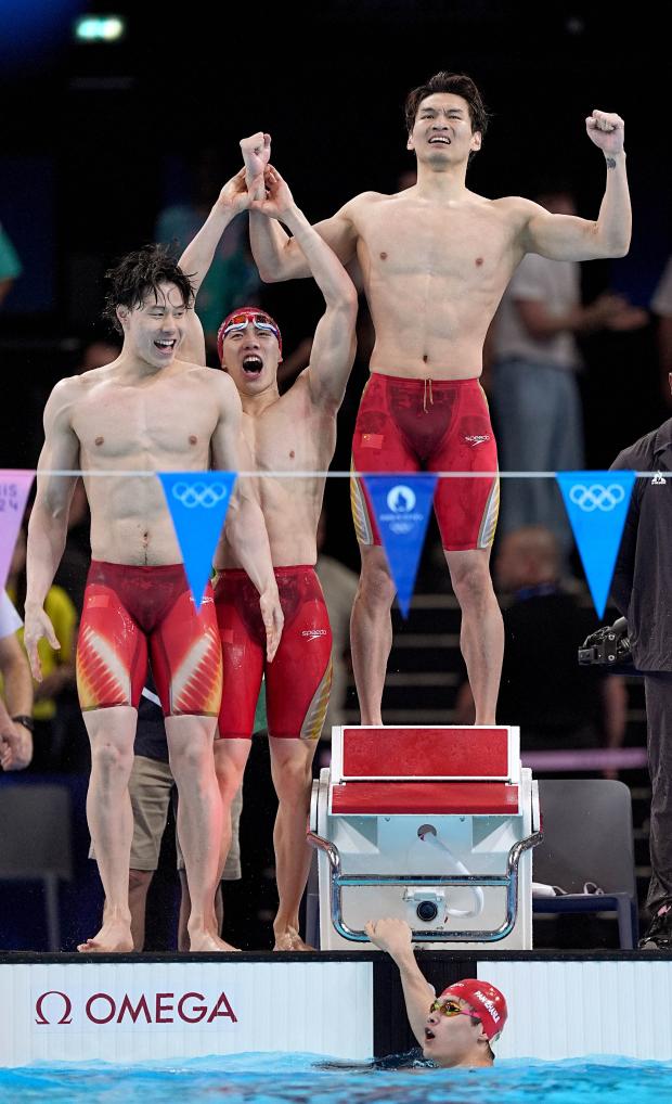 8月4日,冠军中国队选手徐嘉余(上右)、覃海洋(上左)、孙佳俊(上中)、潘展乐在比赛后庆祝。新华社记者 杜宇 摄