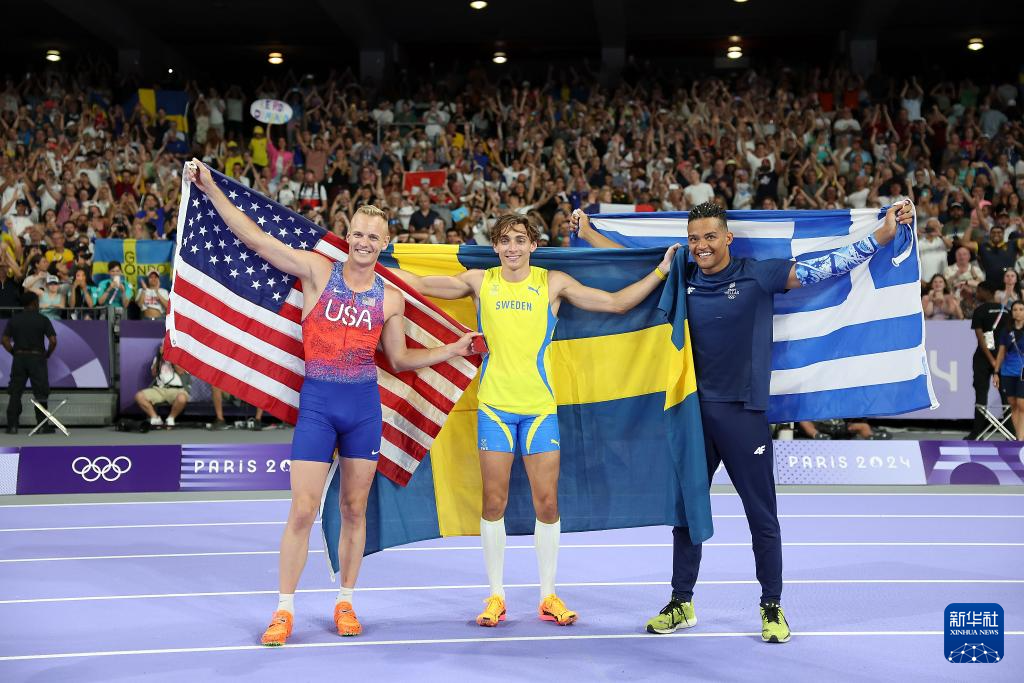 8月5日,冠军瑞典选手杜普兰蒂斯(中)、亚军美国选手肯德里克斯(左)、季军希腊选手卡拉利斯在赛后庆祝。