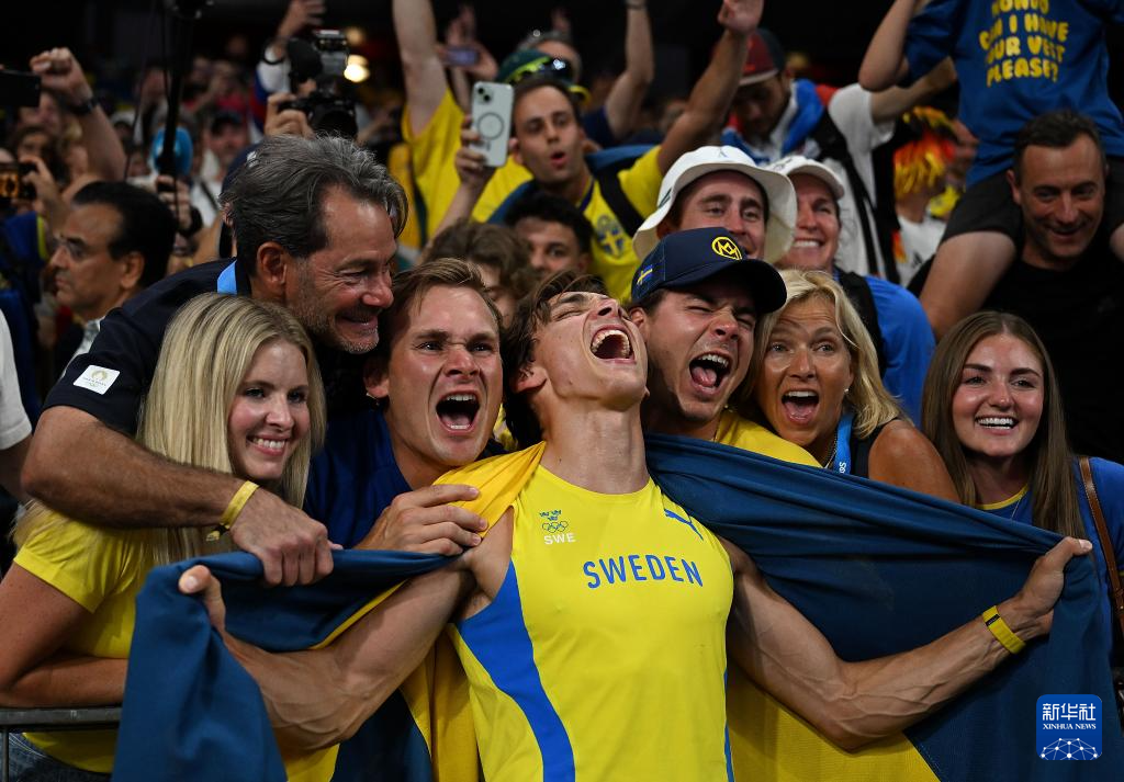 8月5日,瑞典选手杜普兰蒂斯(中)在赛后庆祝。