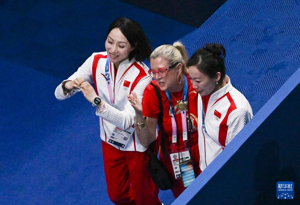 8月6日,中国队教练张晓欢(右)、贺晓初(左)与安娜在赛后庆祝。新华社记者 夏一方 摄