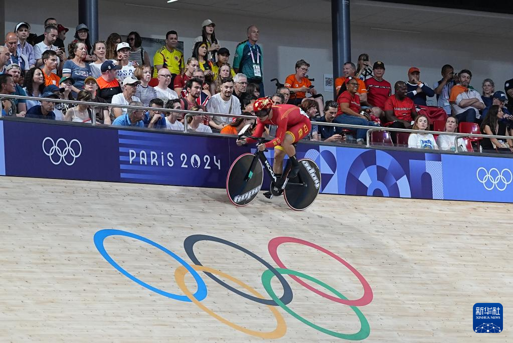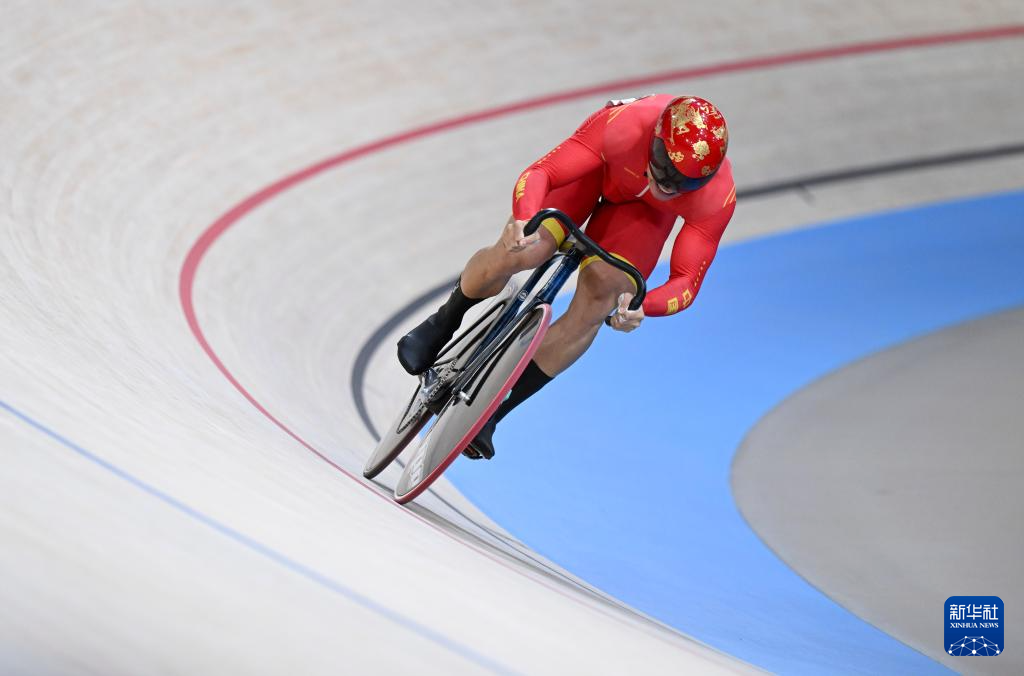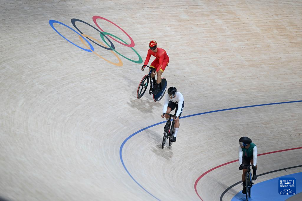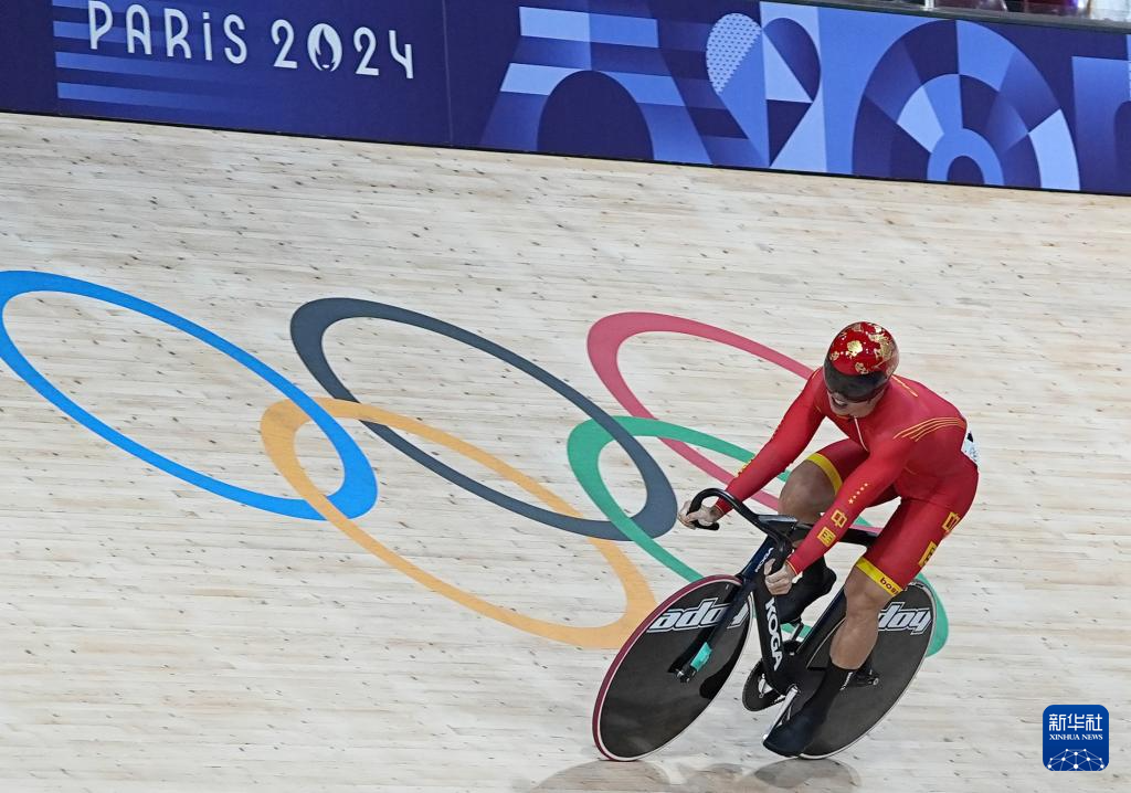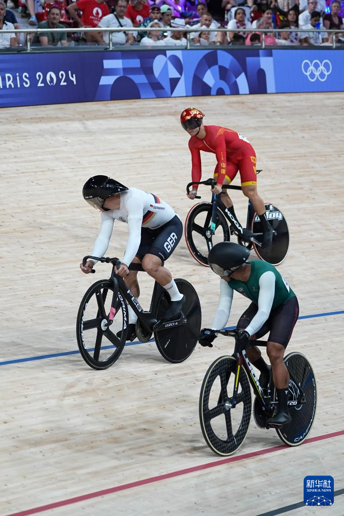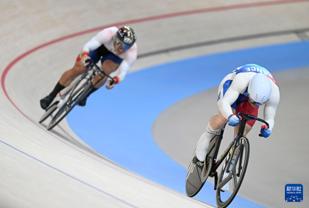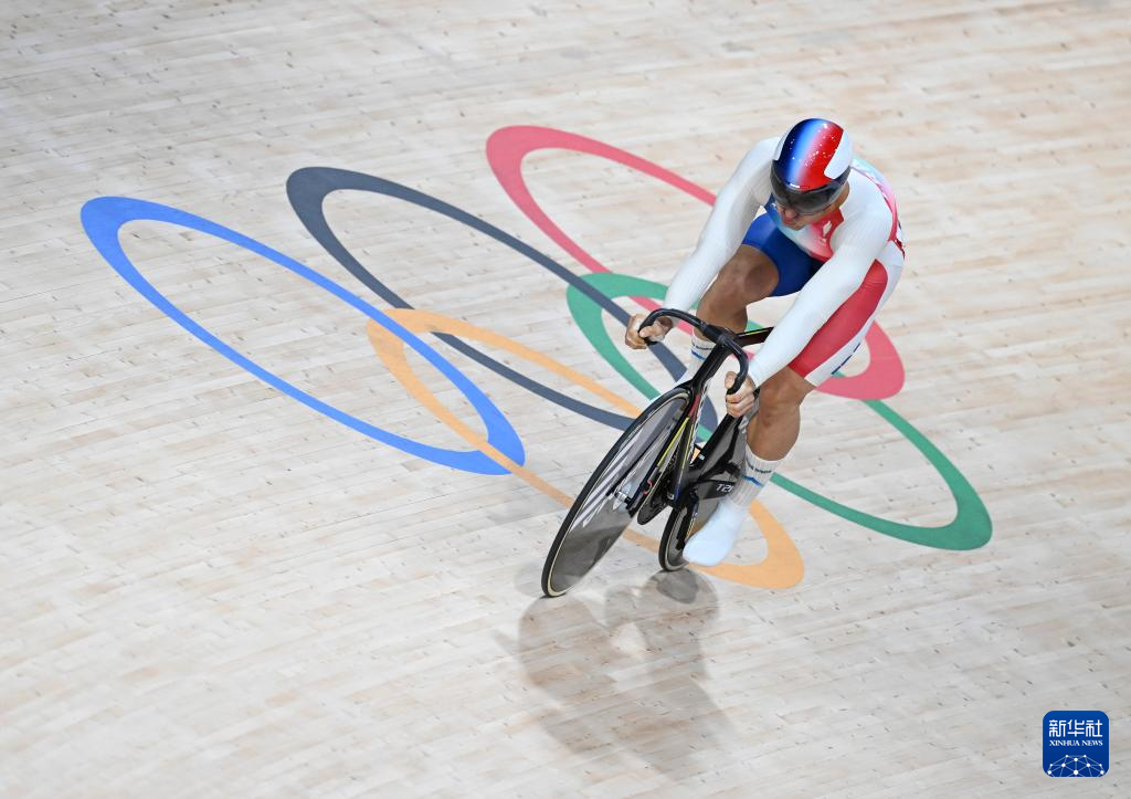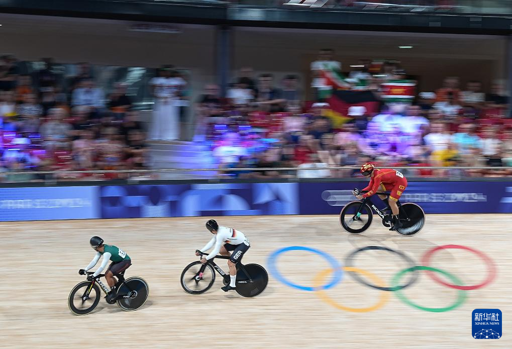 当日,巴黎奥运会场地自行车男子争先赛在圣康丁伊夫林自行车馆举行。