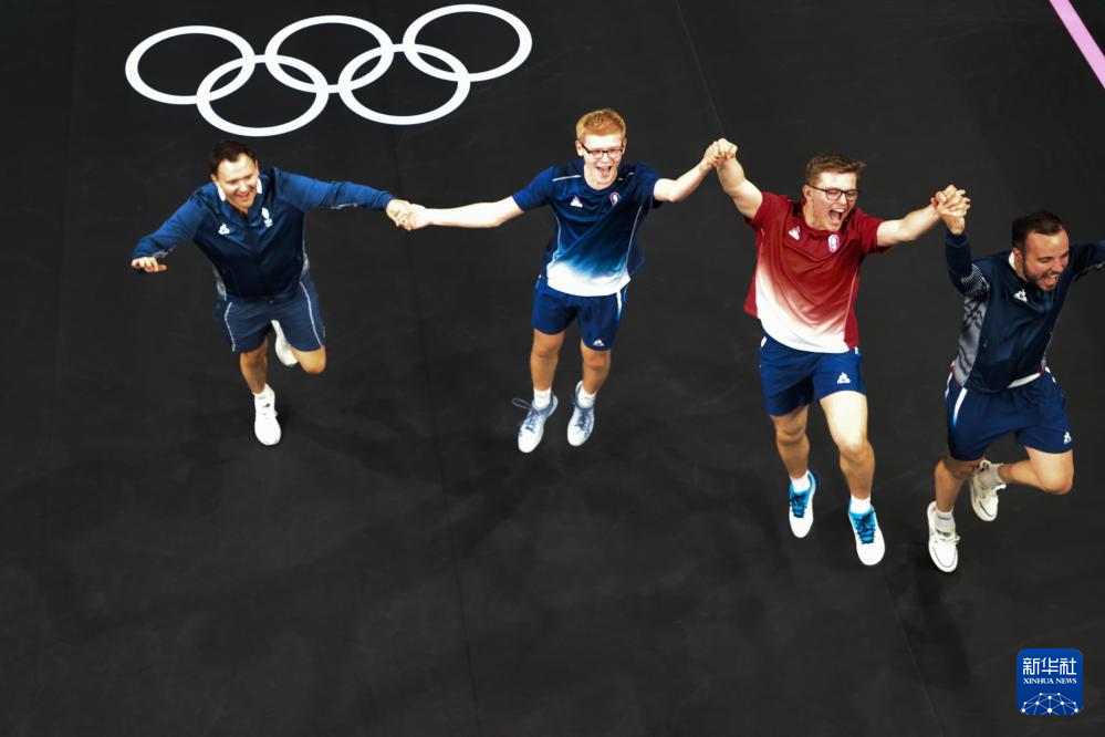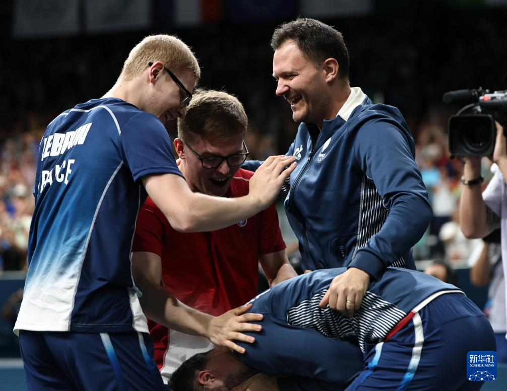 8月9日,法国队庆祝比赛胜利。新华社记者 陈益宸 摄