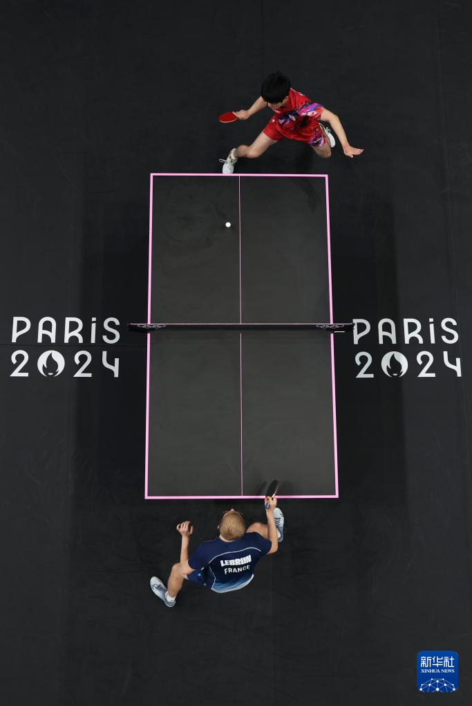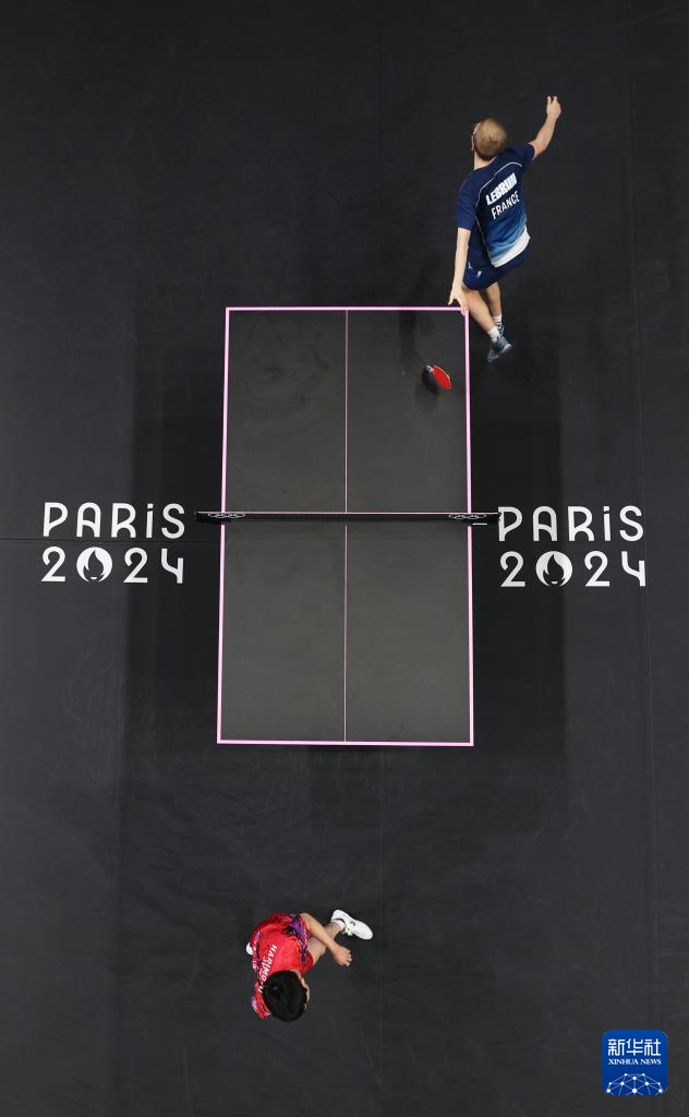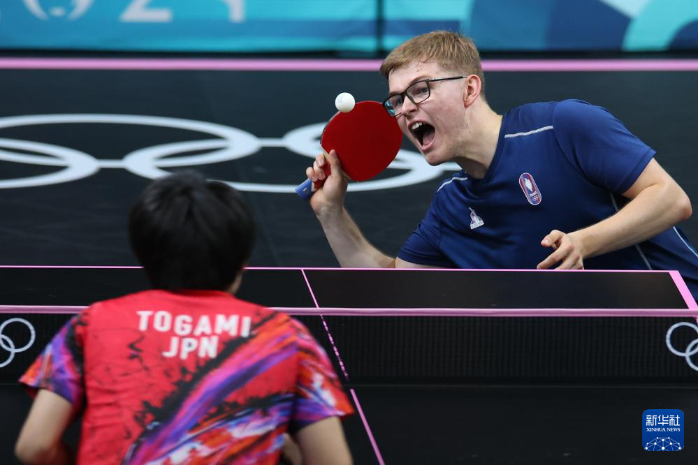 8月9日,日本选手张本智和(上)与法国选手菲利克斯·勒布伦在比赛中。新华社记者 郭昱 摄