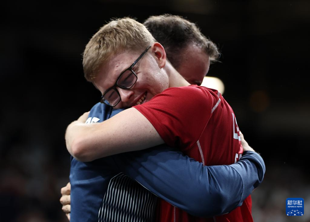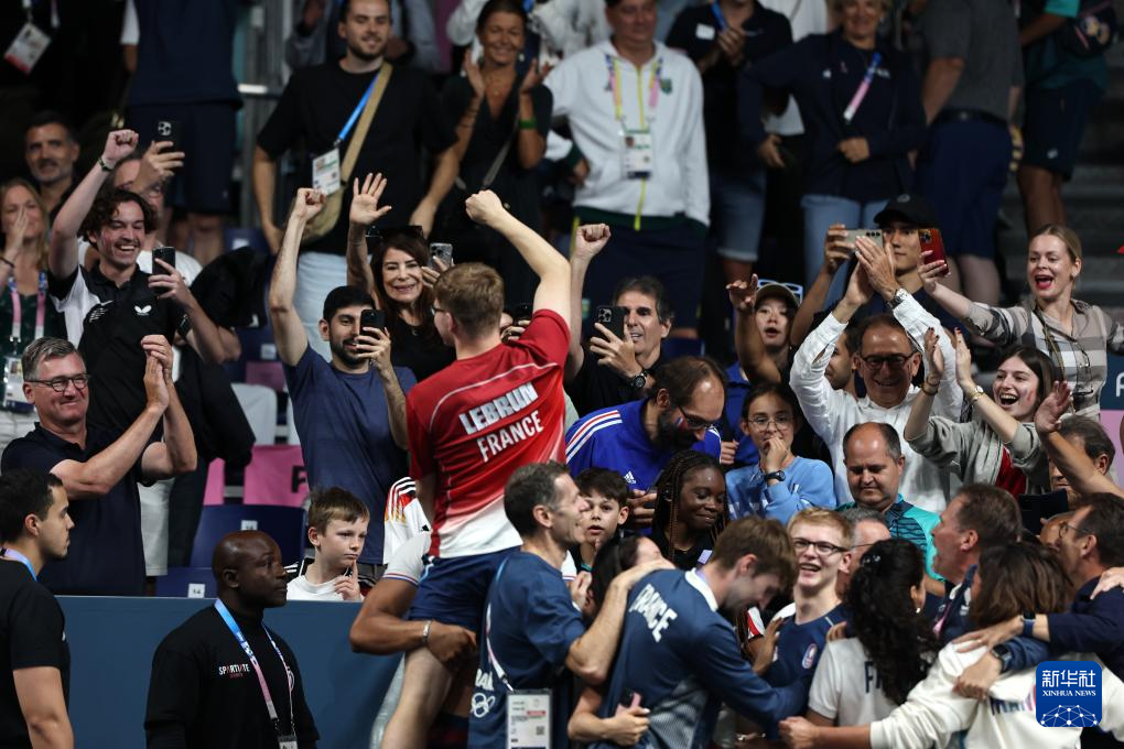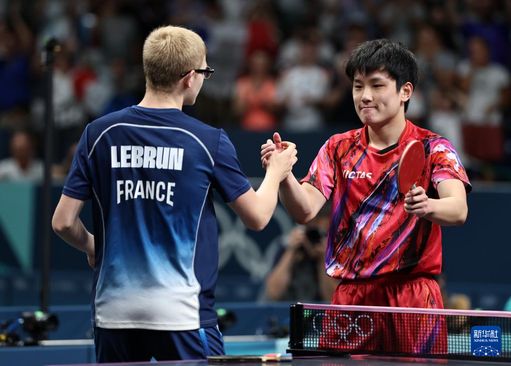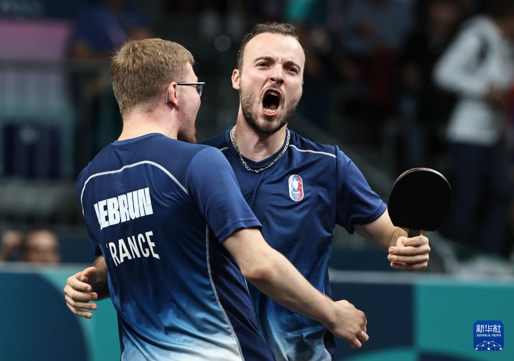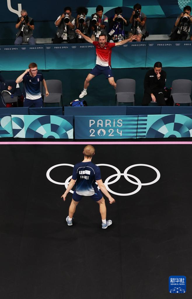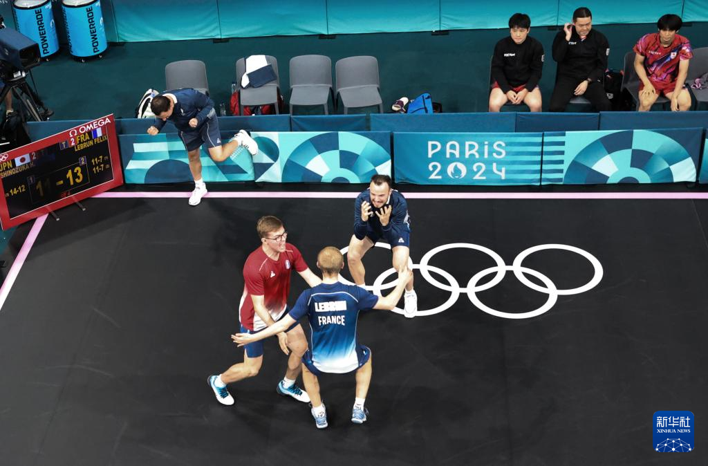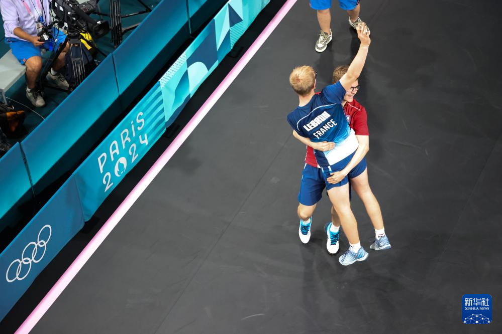 8月9日,法国选手菲利克斯·勒布伦(下)在与日本选手张本智和的比赛后庆祝。新华社记者 郭昱 摄