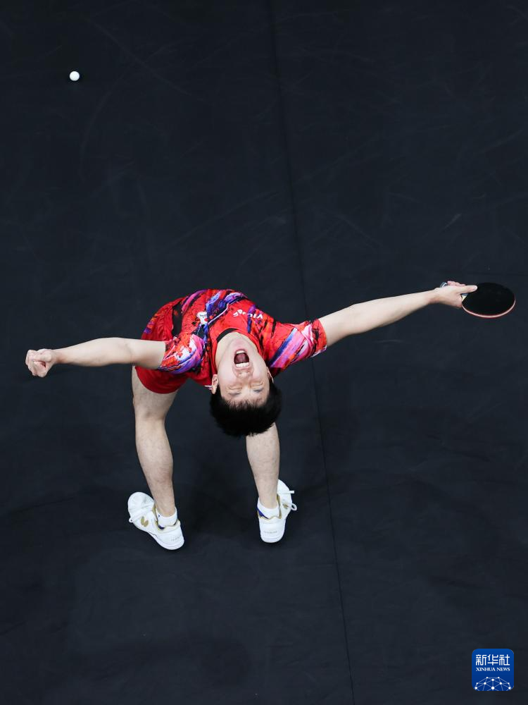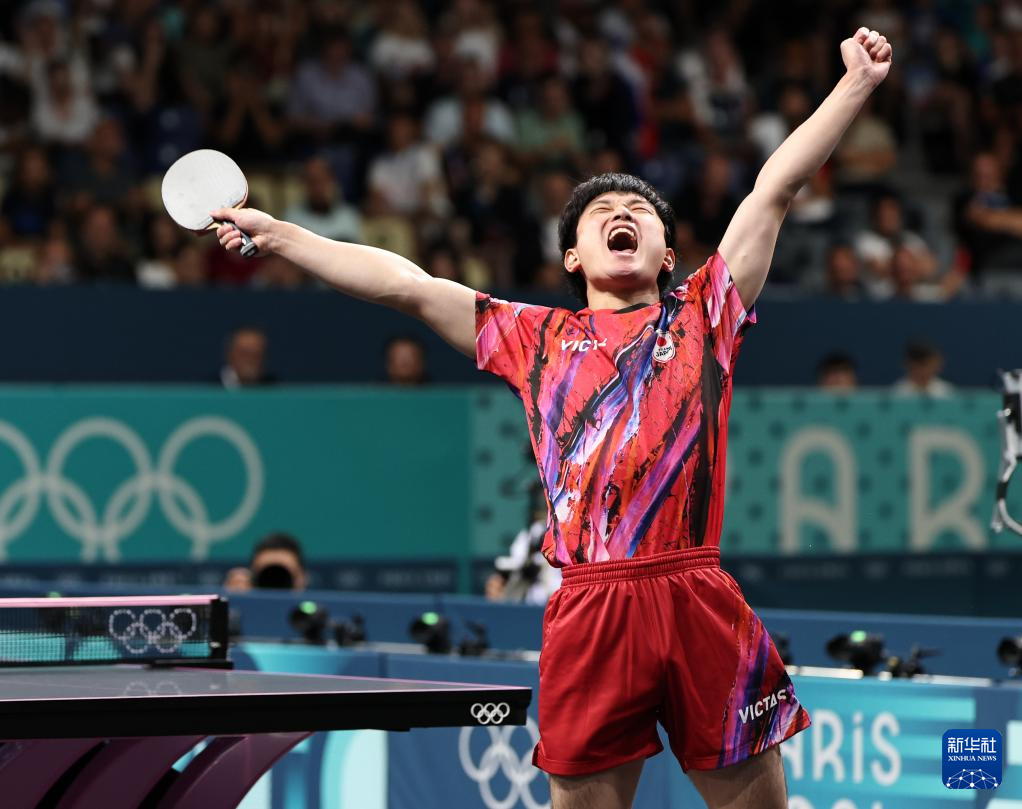 8月9日,日本队选手张本智和在对阵法国队选手西蒙·高茨的比赛获胜后。张本智和3比1战胜西蒙·高茨。新华社记者 王东震 摄