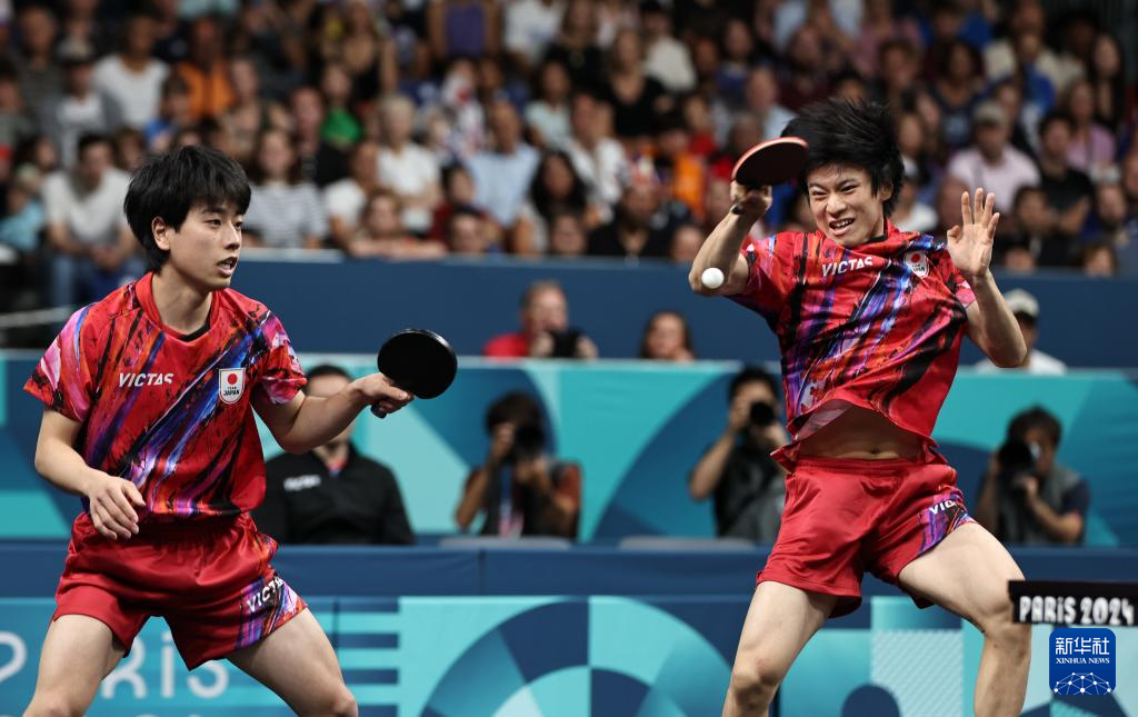 8月9日,日本队组合户上隼辅(右)/篠塚大登在比赛中。他们1比3不敌法国队组合西蒙·高茨/艾利克斯·勒布伦。新华社记者 王东震 摄