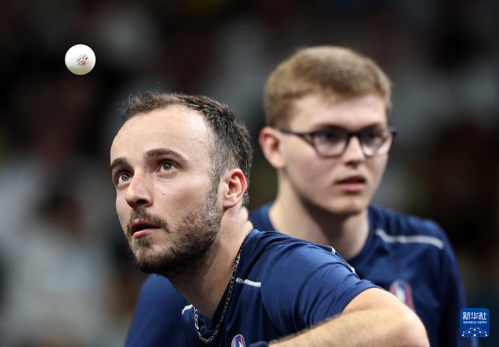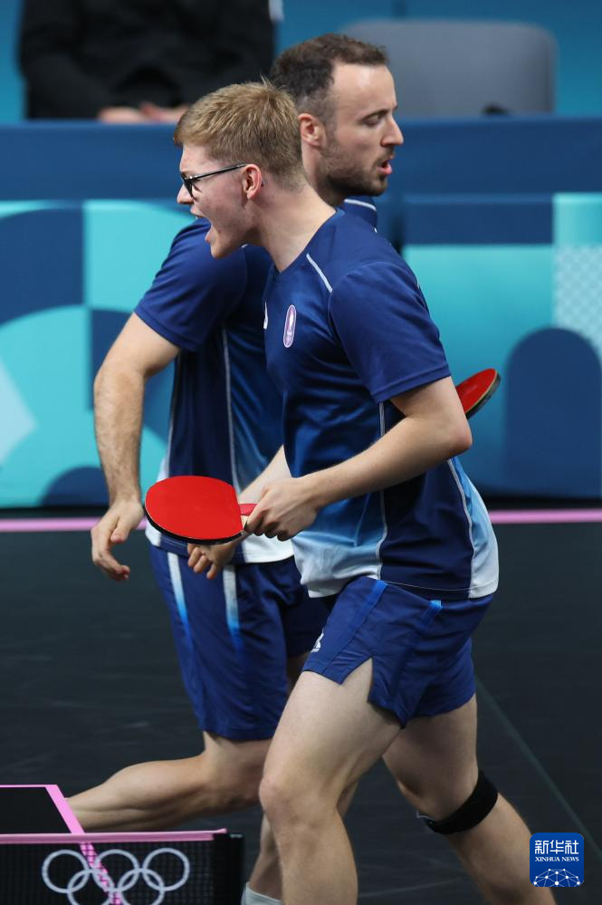 8月9日,法国队组合西蒙·高茨(后)/艾利克斯·勒布伦在比赛中。他们3比1战胜日本队组合户上隼辅/篠塚大登。新华社记者 刘续 摄