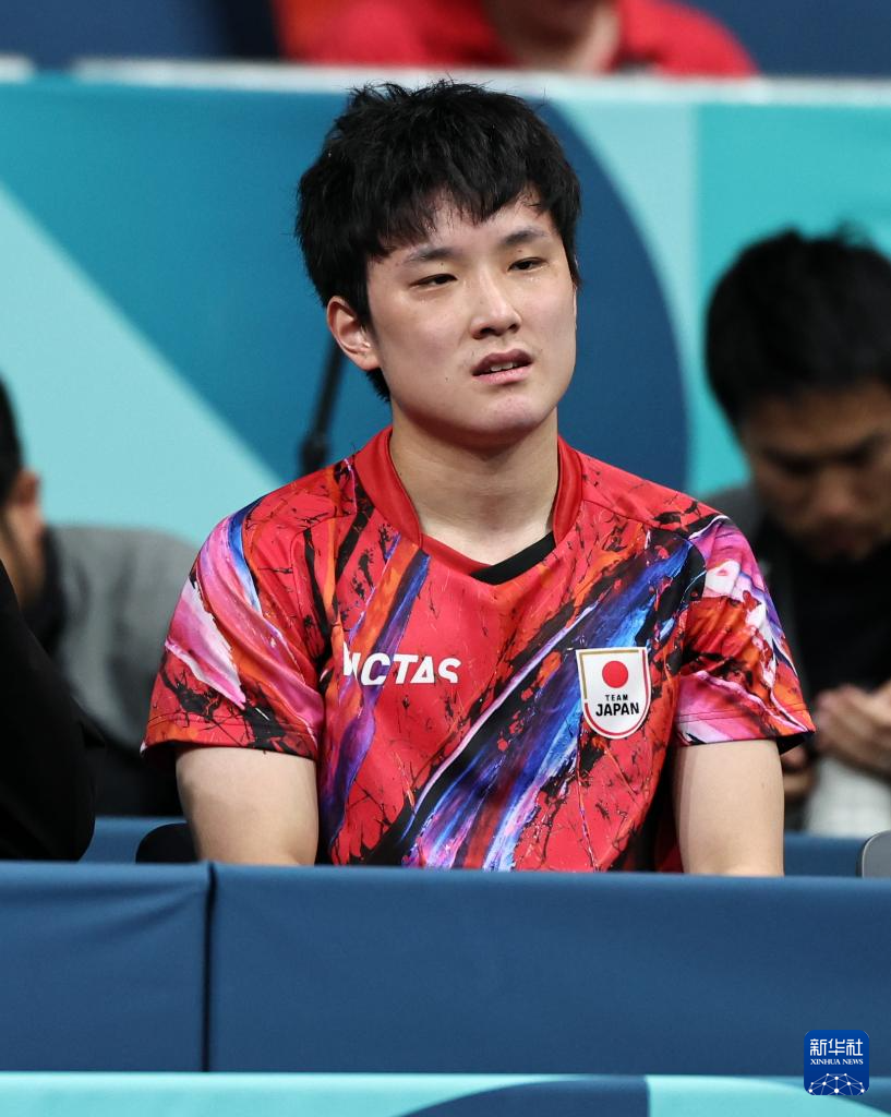 8月9日,日本队选手张本智和在输掉对阵法国队选手菲利克斯·勒布伦的比赛后。张本智和2比3不敌菲利克斯·勒布伦。新华社记者 王东震 摄