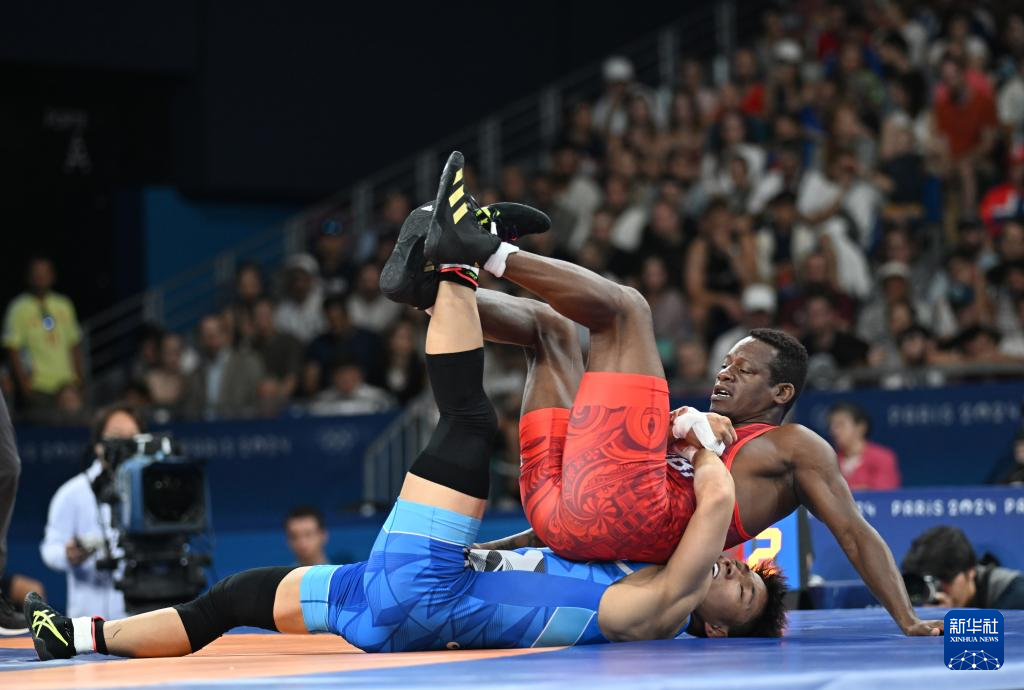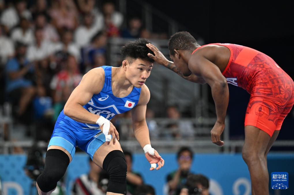 8月9日,在巴黎奥运会摔跤男子自由式74公斤级八分之一决赛中,日本选手高谷大地(蓝)战胜古巴选手卡瓦列罗。新华社记者武巍摄
