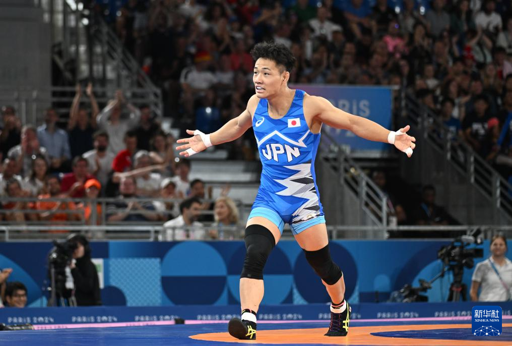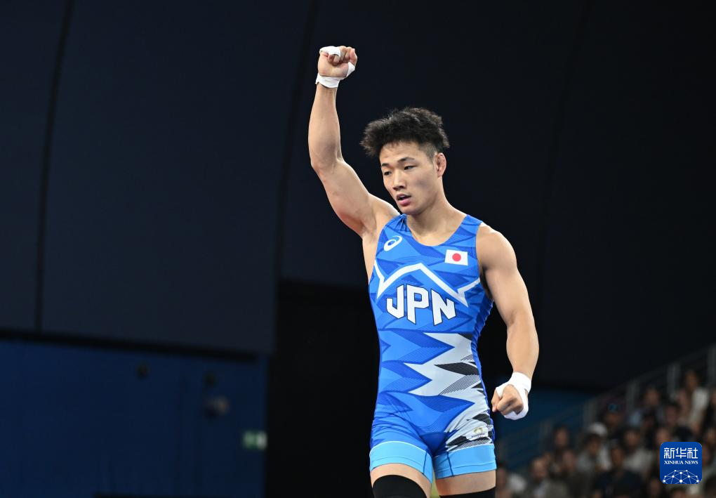 8月9日,在巴黎奥运会摔跤男子自由式74公斤级八分之一决赛中,日本选手高谷大地(蓝)战胜古巴选手卡瓦列罗后庆祝。新华社记者武巍摄