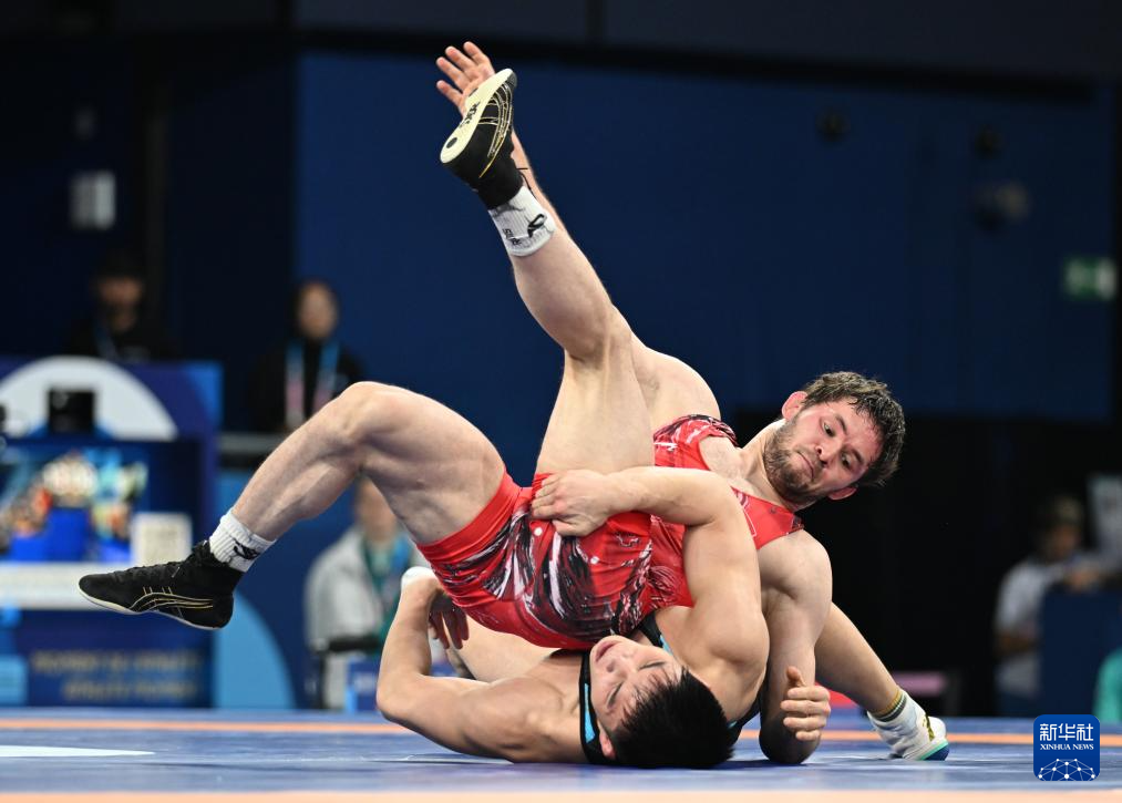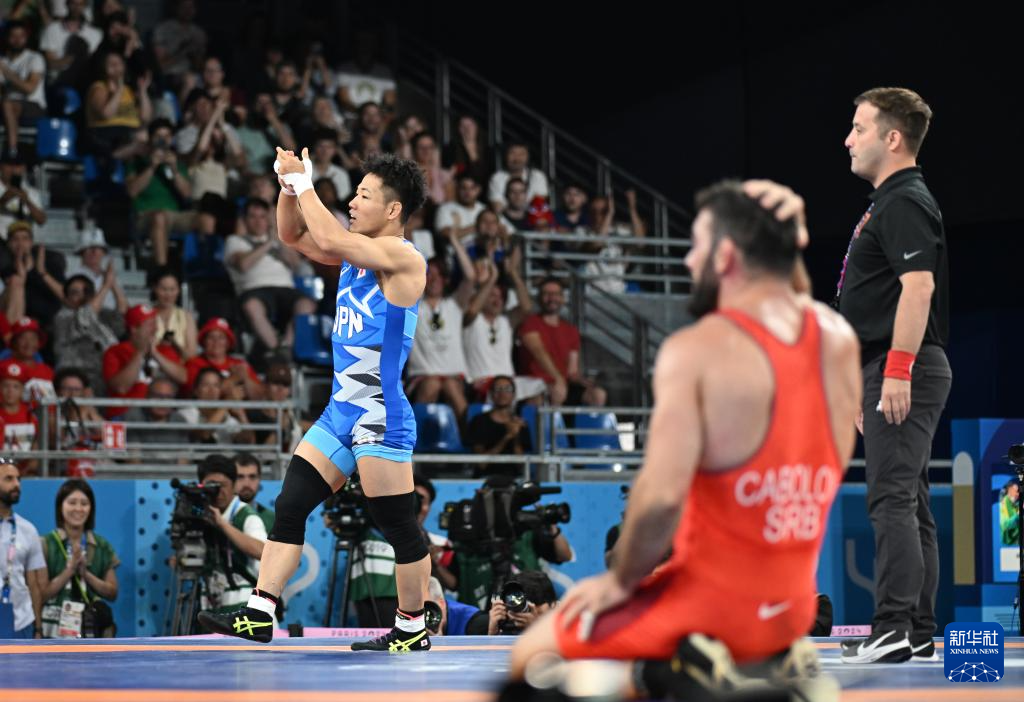 8月9日,在巴黎奥运会摔跤男子自由式74公斤级四分之一决赛中,高谷大地(蓝)战胜塞尔维亚选手卡巴洛夫。新华社记者武巍摄