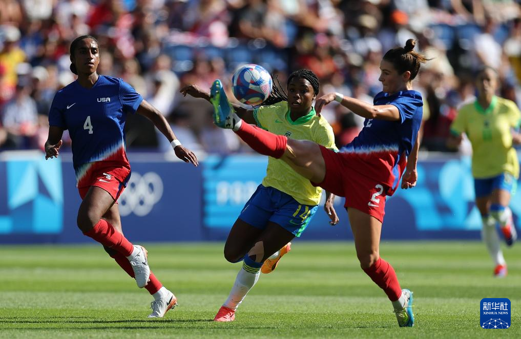 8月10日,巴西队球员卢德米拉(中)与美国队球员埃米莉在比赛中拼抢。