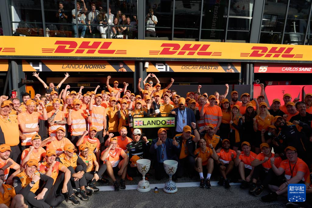 8月25日,迈凯伦车队成员在比赛后庆祝。新华社记者 孟鼎博 摄