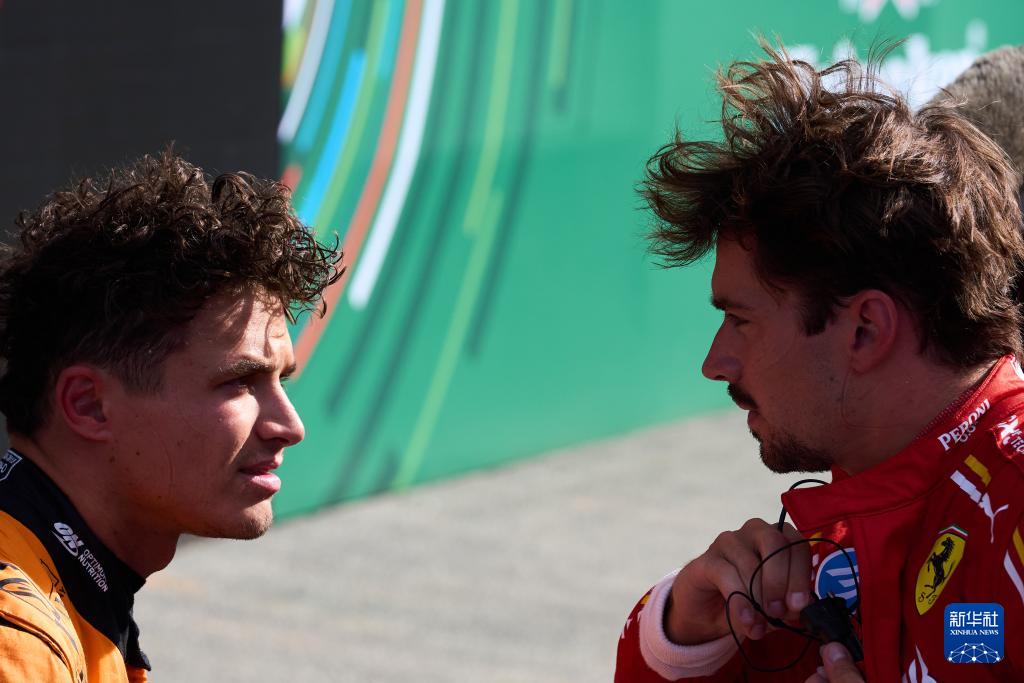 8月25日,迈凯伦车队英国车手诺里斯(左)与法拉利车队摩纳哥车手勒克莱尔在比赛后。新华社记者 孟鼎博 摄
