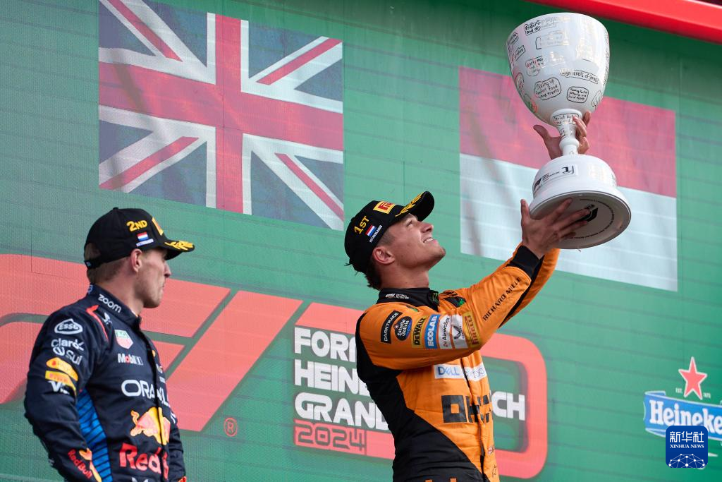 8月25日,迈凯伦车队英国车手诺里斯(右)在赛后颁奖仪式上捧起冠军奖杯。新华社记者 孟鼎博 摄
