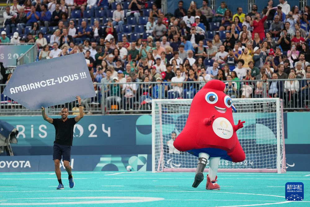 9月3日,工作人员和巴黎残奥会吉祥物在中场休息时与观众进行互动。