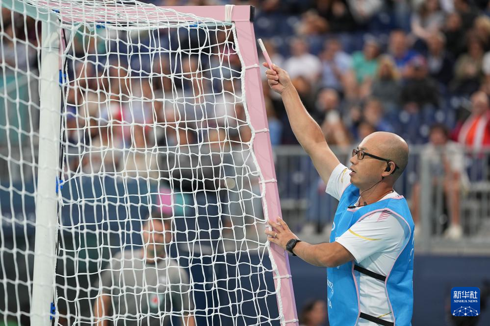9月3日,中国队引导员李进在比赛中用金属棒敲击门框帮助球员定位。