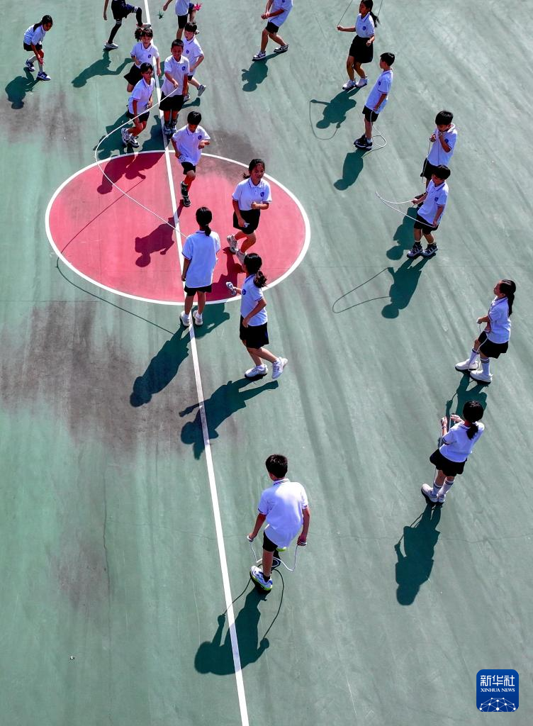 9月14日,学生在大课间进行花样跳绳(无人机照片)。新华社发(王须中摄)
