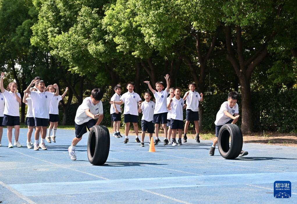 9月14日,学生在大课间滚轮胎。新华社发(王须中摄)