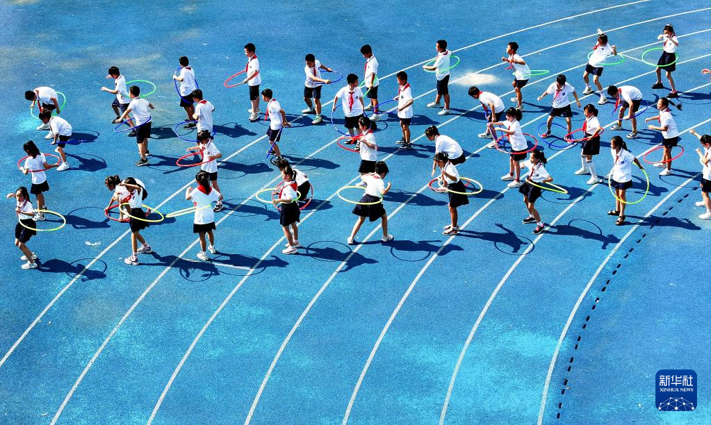 9月14日,学生在大课间练习呼拉圈(无人机照片)。新华社发(王须中摄)