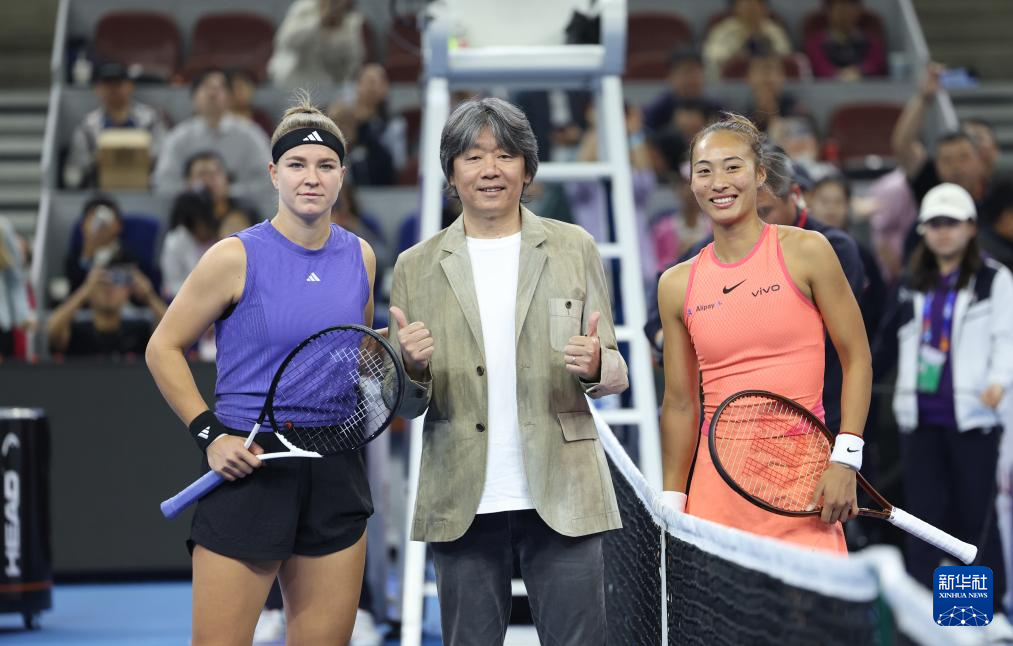 10月5日,郑钦文(右)、穆霍娃(左)与本场比赛挑边嘉宾、歌手老狼在比赛前合影。