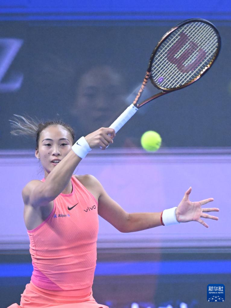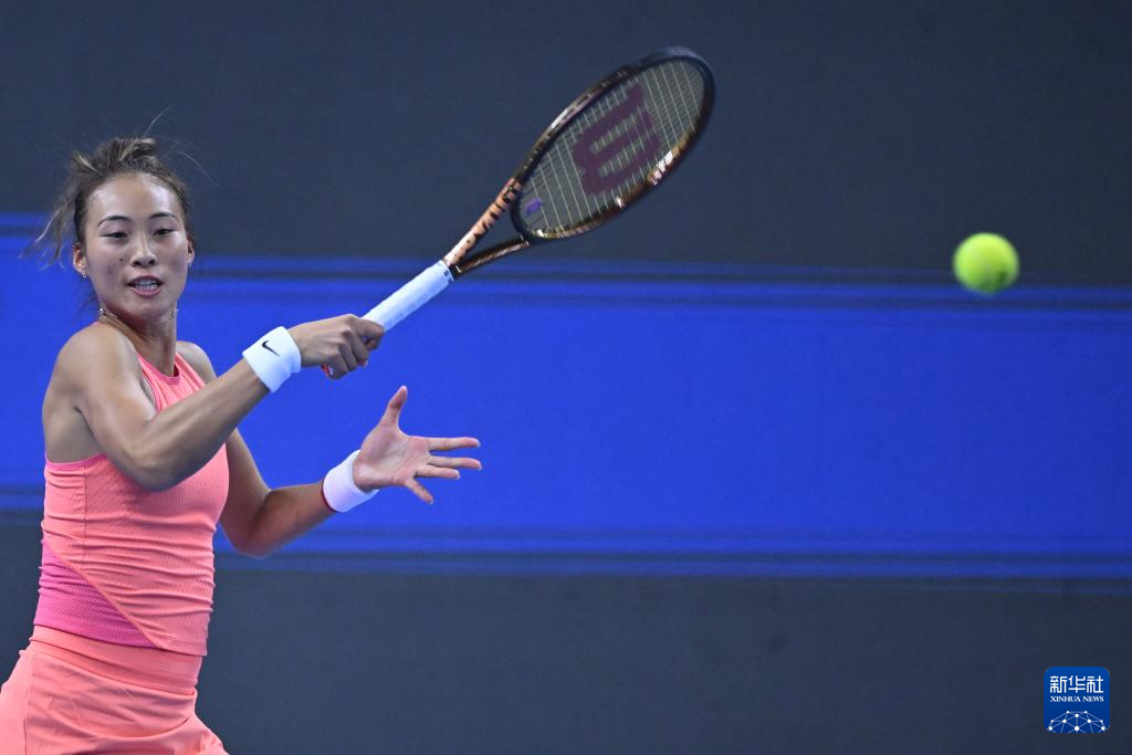 10月5日,郑钦文在比赛中回球。