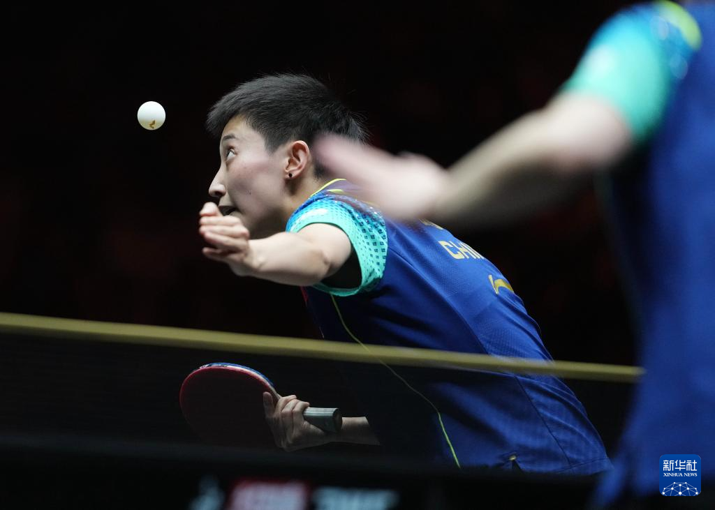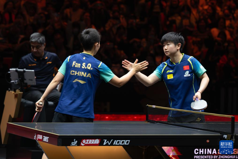 10月5日,孙颖莎(左)在比赛中回球。