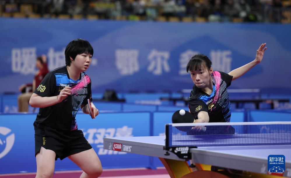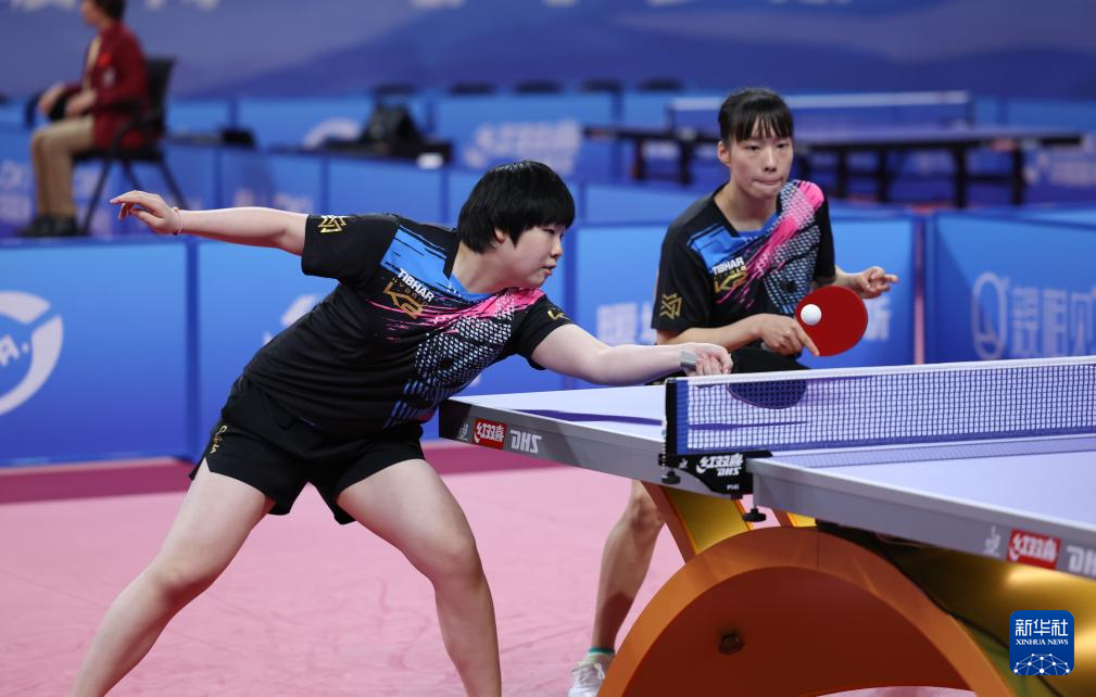 10月18日,江苏队组合石洵瑶/蒯曼(左)在双打比赛中。最终,她们3比0战胜四川队组合冷雨桐/郭艳。