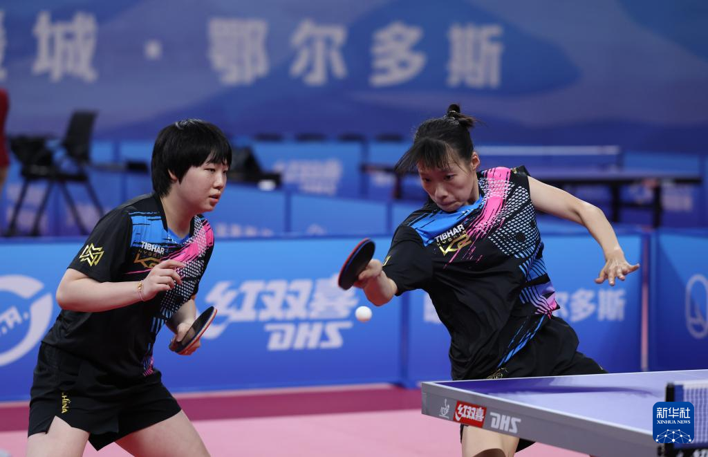10月18日,江苏队组合石洵瑶(右)/蒯曼在双打比赛中。最终,她们3比0战胜四川队组合冷雨桐/郭艳。