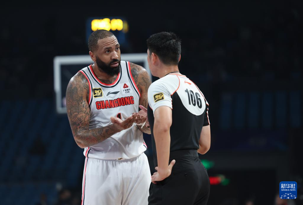10月25日,广东东阳光队球员吉伦沃特(左)在比赛中与裁判交流。