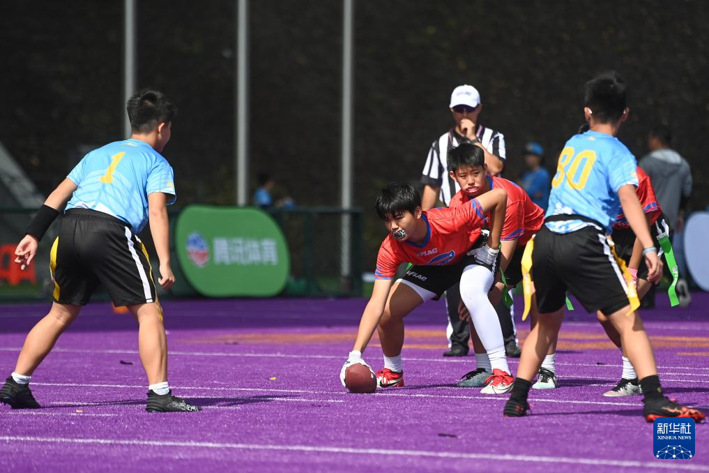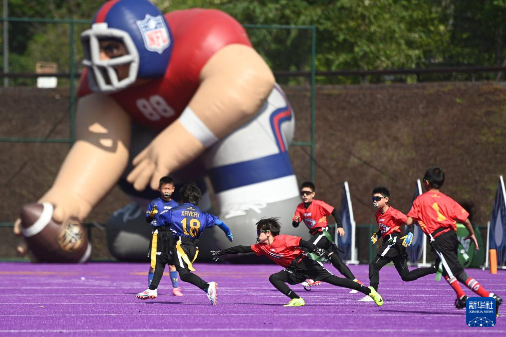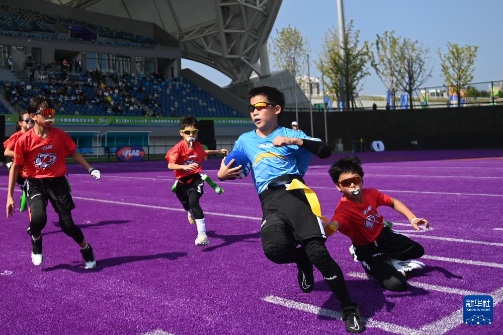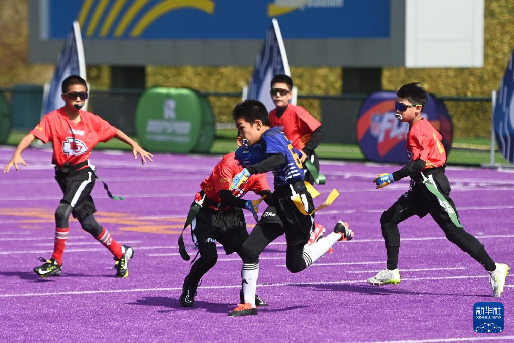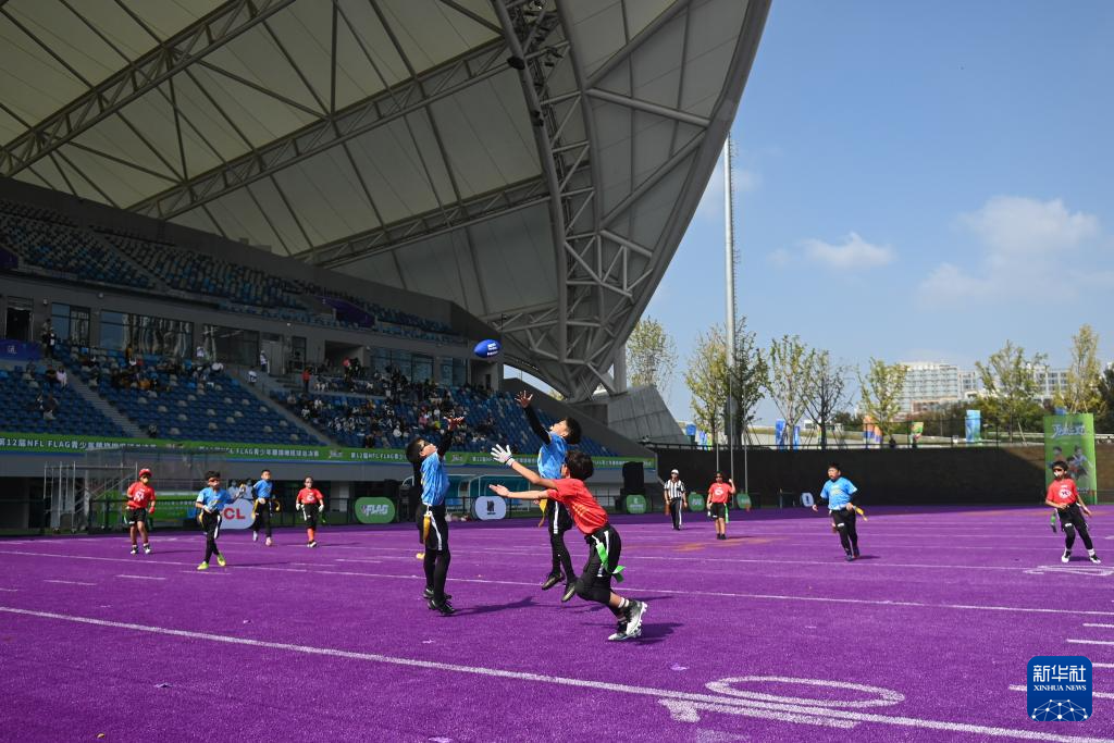 当日,第12届NFL FLAG"勇者之冠"青少年腰旗橄榄球总决赛在杭州拱墅运河体育公园体育场开赛。来自全国17个城市的46支青少年橄榄球队参与角逐,比赛共分U6、U8、U10、U12和U14五个年龄组别。