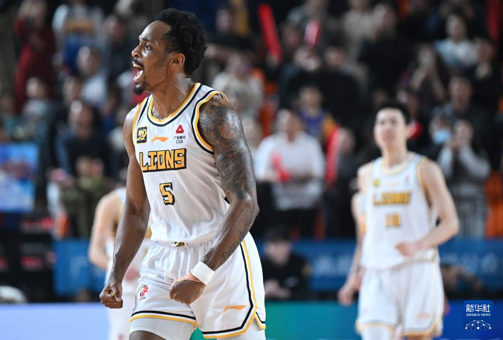 11月3日,新疆伊力特队球员皮特森在比赛中庆祝关键球得分。