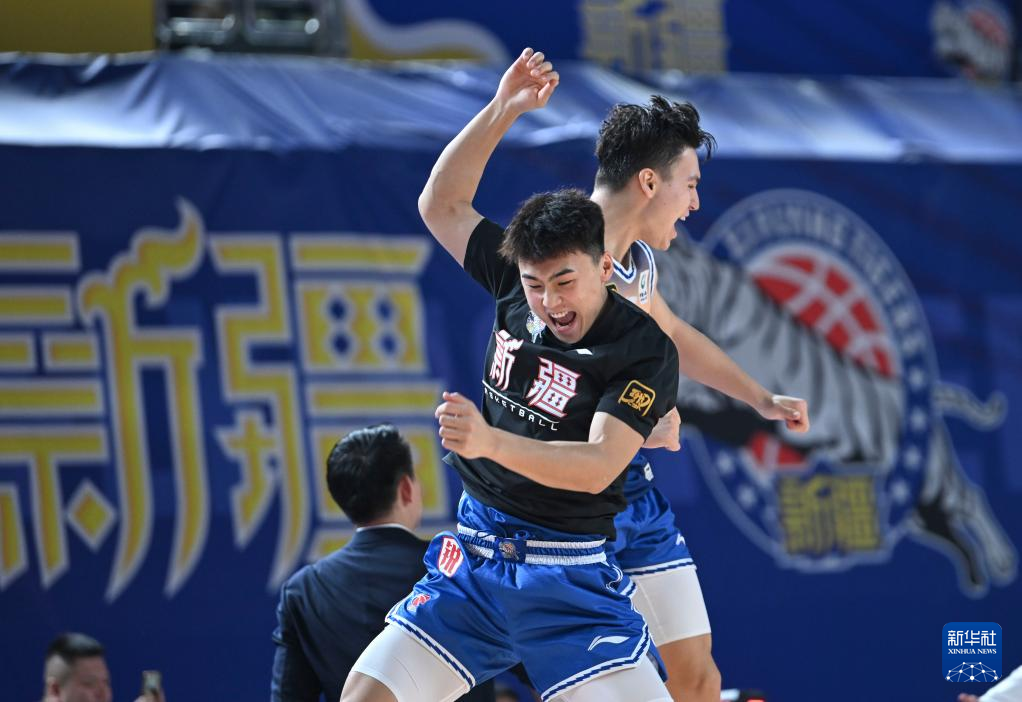 11月3日,新疆伊力特队球员葛浩然(左)与队友伊力福拉提在赛后庆祝。