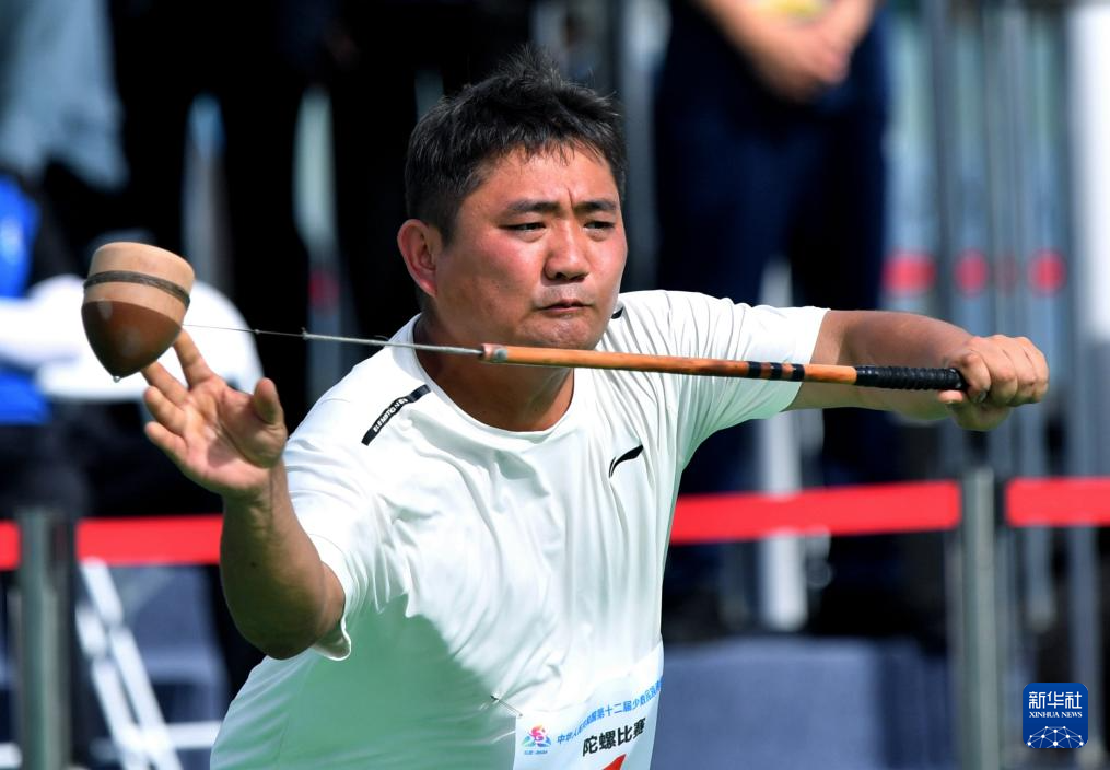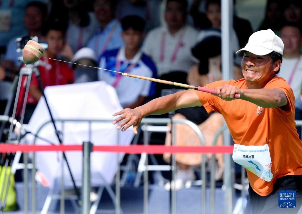 11月25日,重庆队选手普祥富在比赛中投掷陀螺。