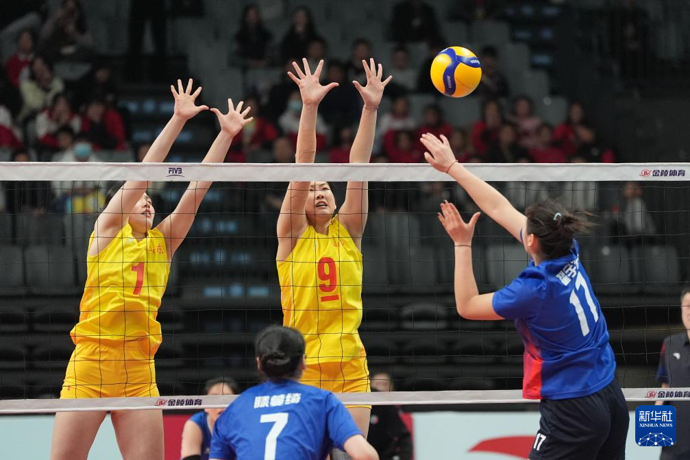 11月27日,山东队球员李晨瑄(中)、李美君(左)在比赛中拦网。