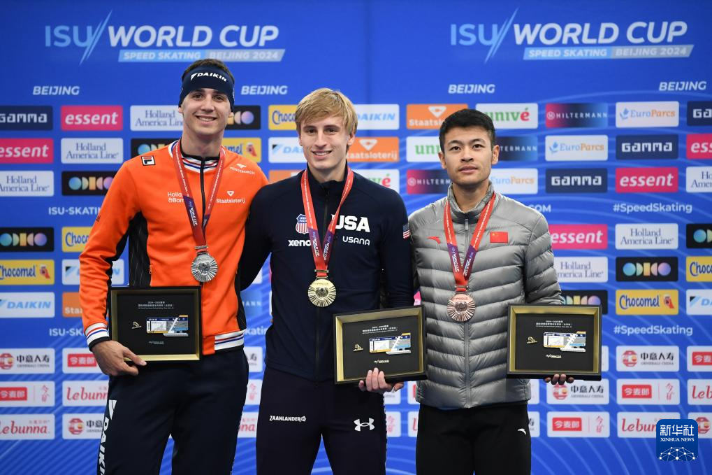 11月30日,获得金牌的美国选手乔丹·斯托尔兹(中)、获得银牌的荷兰选手杰宁·德布(左)和获得铜牌的中国选手宁忠岩在颁奖仪式上合影。新华社记者 鞠焕宗 摄