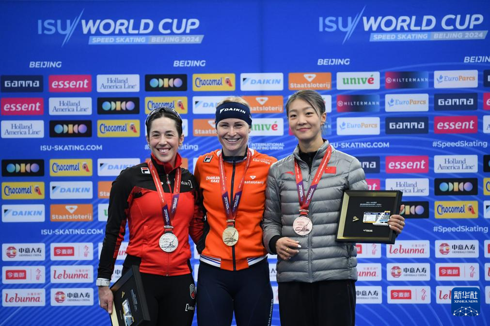 12月1日,冠军荷兰选手玛丽克·格勒内沃德(中)、亚军加拿大选手瓦莱丽·马尔泰(左)和季军中国选手杨滨瑜在颁奖仪式上。