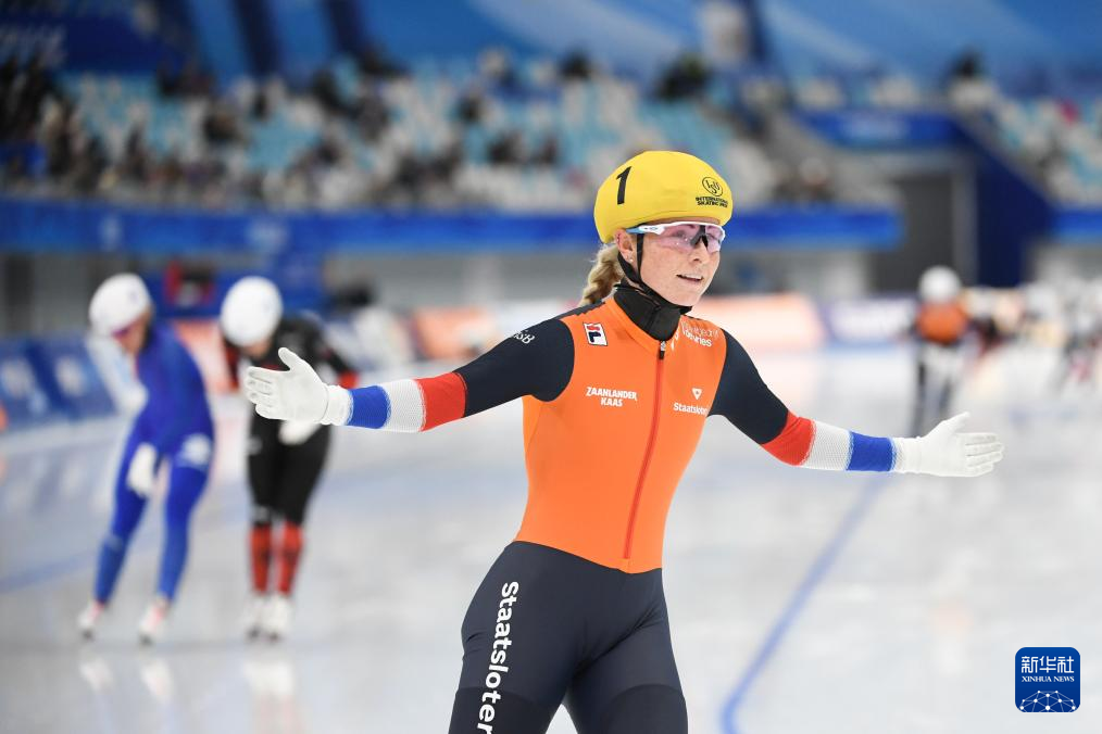 12月1日,荷兰选手玛丽克·格勒内沃德(前)在比赛结束后庆祝,她获得冠军。
