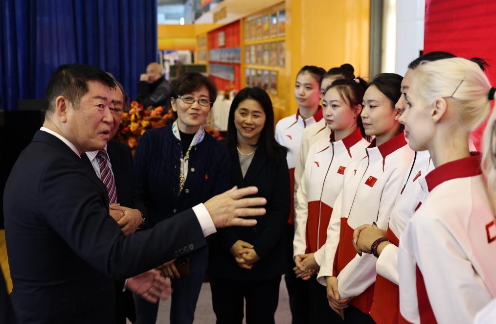 12月20日,获得巴黎奥运会艺术体操项目集体全能金牌的中国艺术体操队成员们与国际体操联合会主席渡边守成(左一)在登榜仪式后交流。新华社记者 贾浩成 摄